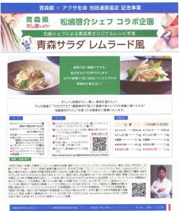 今月は、青森県と松嶋啓介シェフのコラボ企画、松嶋シェフのよる青森県オリジナルレシピ考案 「青森サラダ レムラード風」をご紹介します。